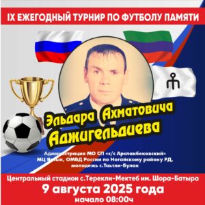 9 августа 2025 года в Центральном стадионе имени Шора -Батыра села Терекли-Мектеб Ногайского района пройдет 8-ой ежегодный турнир по футболу, посвященный памяти Эльдара Ахматовича Аджигельдиева.