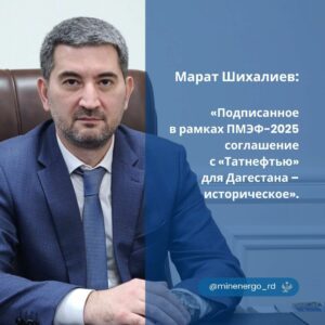 В ходе Петербургского международного экономического форума 2025 года было подписано соглашение между Республикой Дагестан и компанией «Татнефть». Данное событие министр энергетики и тарифов Республики Дагестан Марат Шихалиев охарактеризовал как историческое.