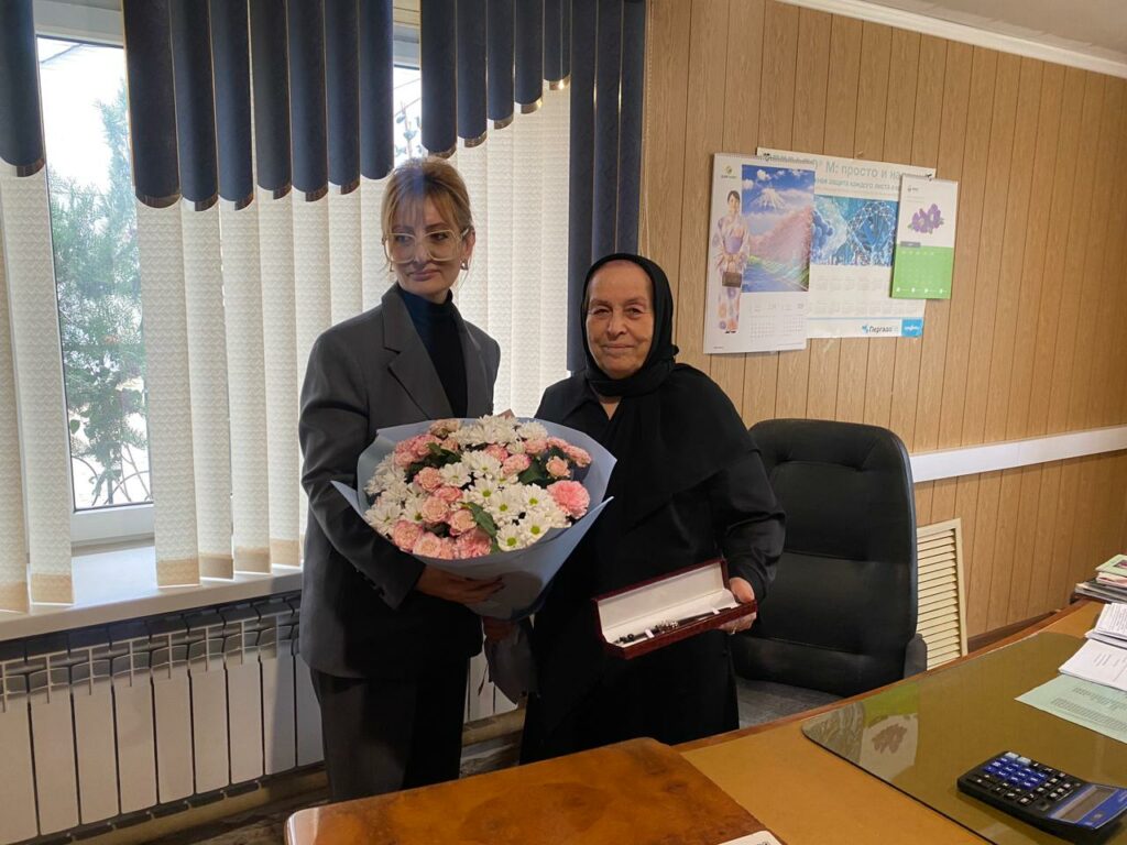 Асият Алиева поблагодарила Бурлият Гаджиеву за многолетнюю добросовестную работу, любовь к родной земле и вручила ей памятные именные часы Председателя Народного Собрания Республики Дагестан.