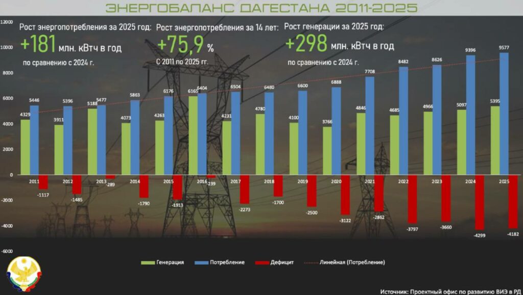 Дефицит баланса энергосистемы Дагестана в 2025 году сократился на 117 млн. кВтч по сравнению с 2024 годом и составил 4182 млн. кВтч. Общий дефицит баланса достиг 44%, который был покрыт за счет перетока электроэнергии из смежных регионов. Лишь в мае и июне, в период паводков и наибольшей активности гидроэлектростанций, наблюдается положительный баланс между генерацией и потреблением электроэнергии. В остальные месяцы дефицит компенсируется перетоками, в основном из Ставропольского края.